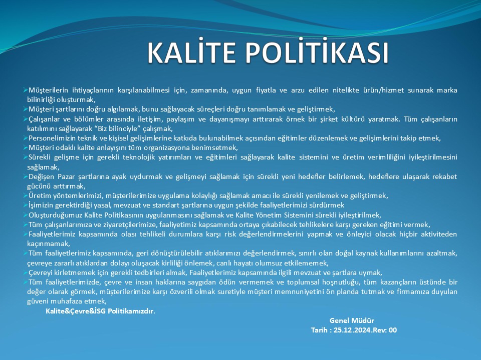 KALİTE POLİTİKAMIZ VE SERTİFİKALARIMIZ
